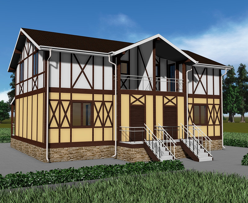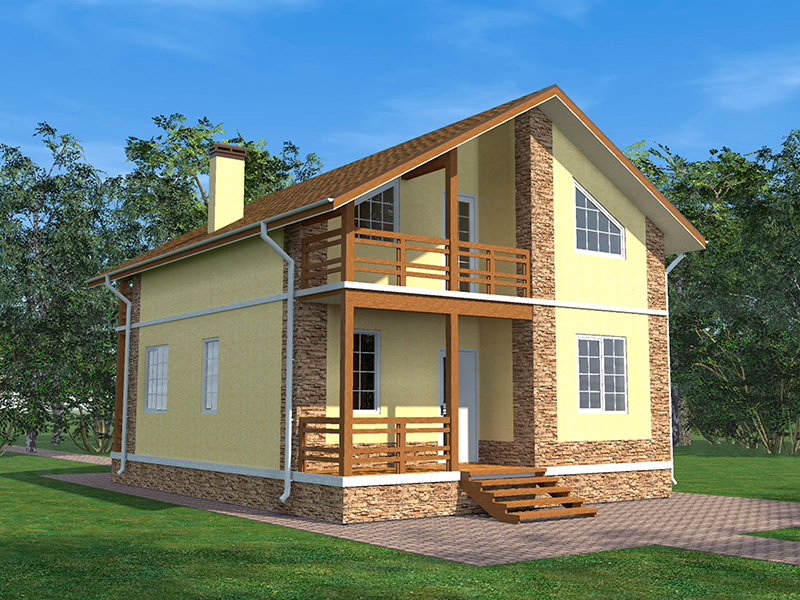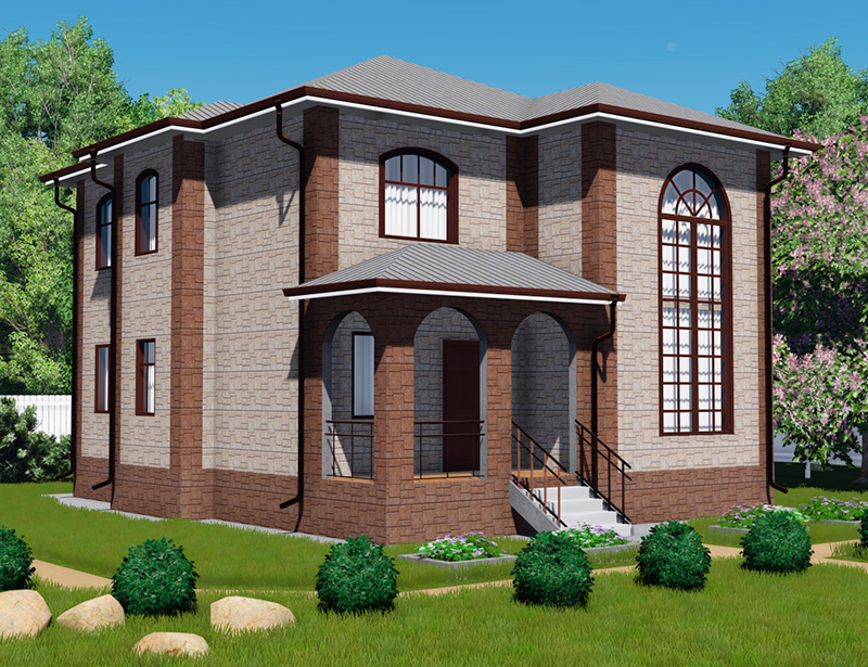 Современный двухэтажный дом. Пространство первого этажа – это главным образом дневная зона, состоящая из зала,комнаты и кухни. Ночная зона, расположенная на втором этаже, включает три спальни и большую ванную комнату.